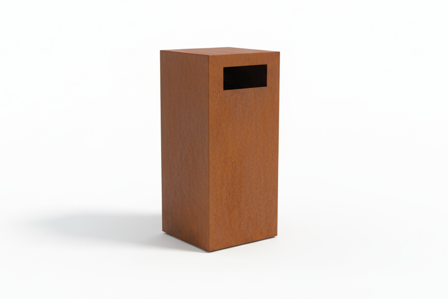 Afvalbak geheel uit CorTenstaal. Deur met driekantslot aan de achterzijde. Voorzien van een aluminium binnenbak.