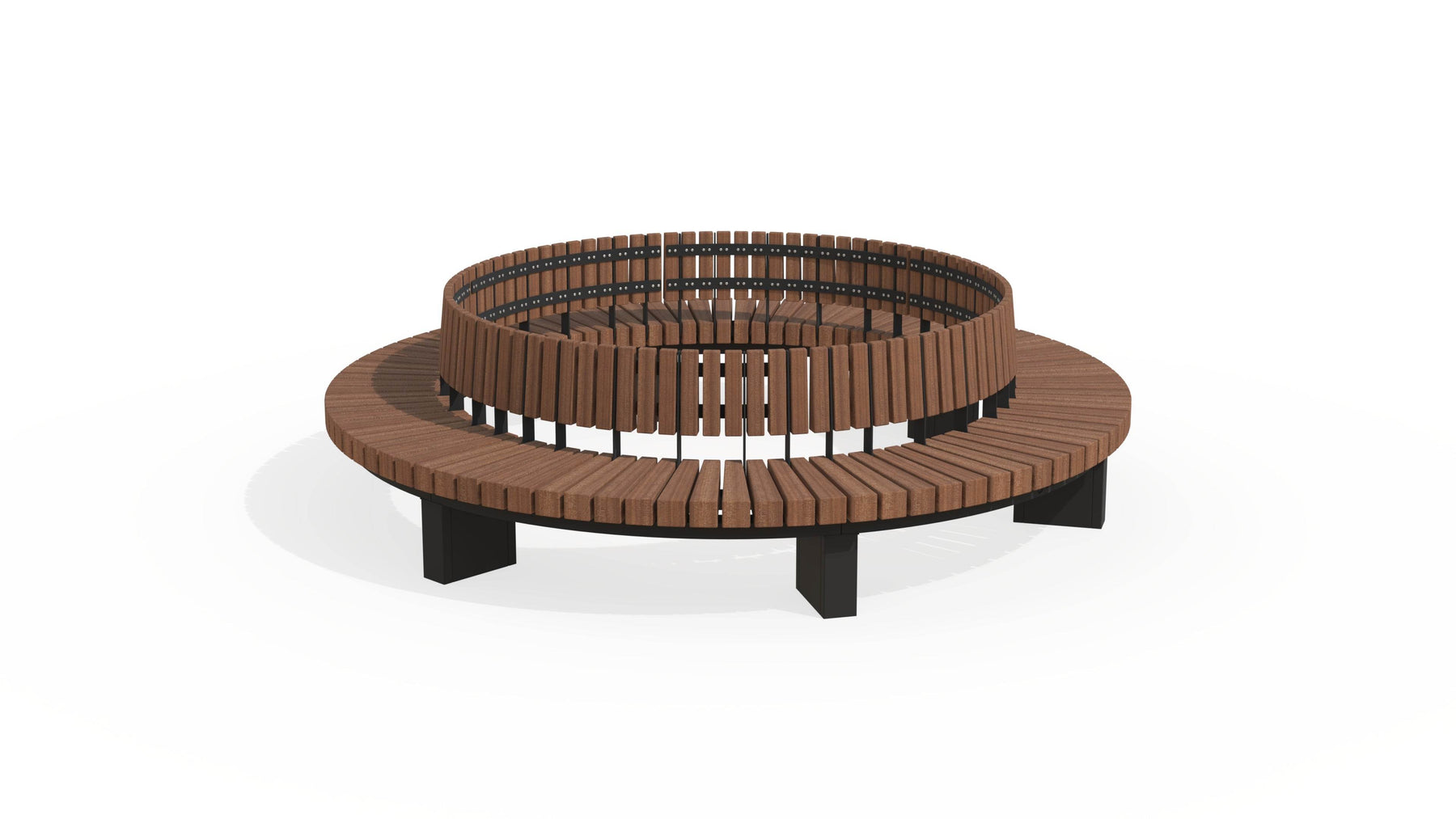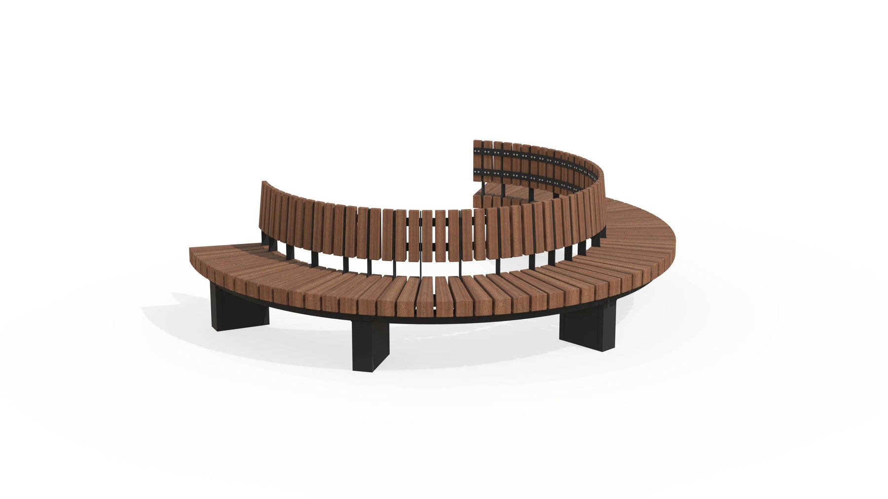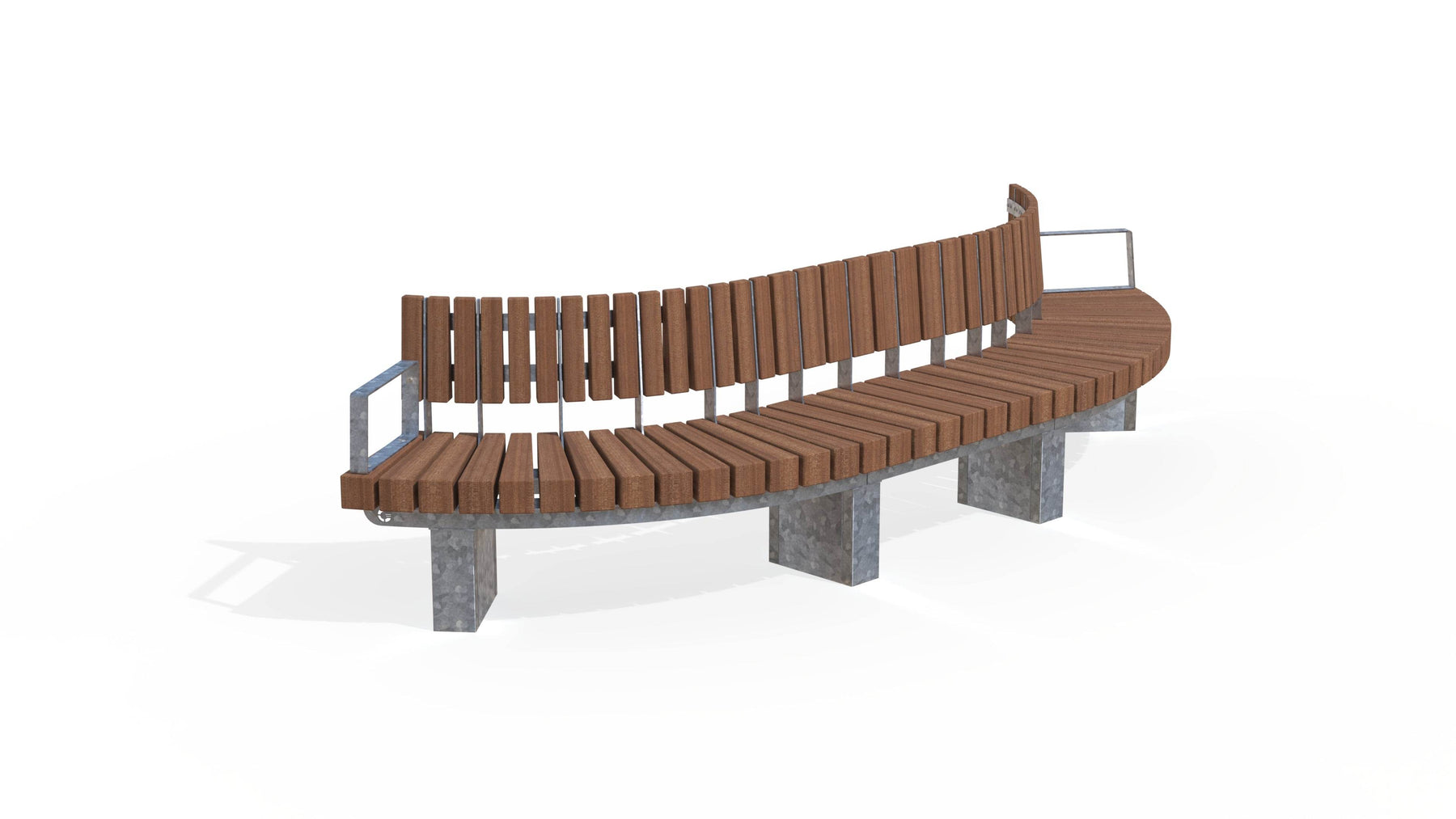 Robuuste gebogen bank in elke denkbare buitendiameter. Balken zijn bij kleinere radii altijd taps gezaagd, waardoor mooie gelijke naden ontstaan. Uniek modulair ontwerp bestaande uit handzame segmenten die eenvoudig op locatie op de poten worden gezet en gekoppeld met M12 rvs bouten.